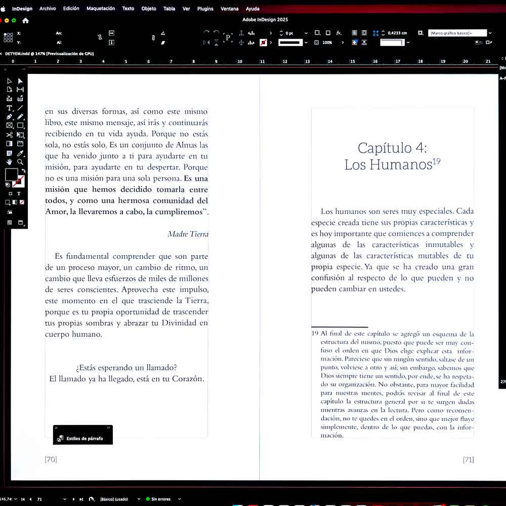 La maquetación —o diagramación— es el proceso de dar forma al interior de tu libro, organizando texto e imágenes de manera clara y atractiva para que cada página sea cómoda de leer y visualmente agradable. Nos encargamos de elegir tipografías, definir márgenes y cuidar cada detalle, asegurándonos de que tu libro no solo se vea bien, sino que también conecte con tus lectores de forma profesional.